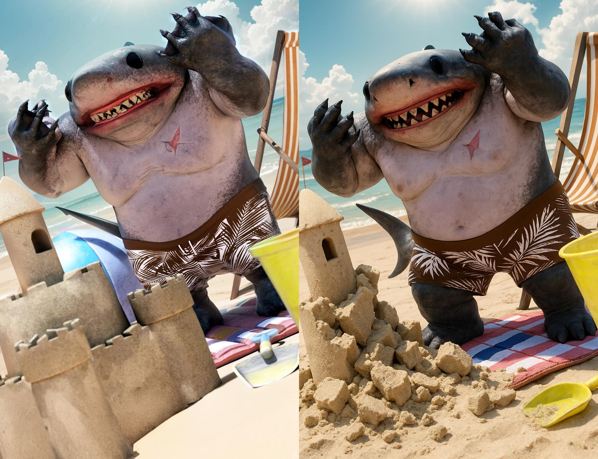 I'd always wanted the sand castle in my teddy bear / shark morph combo promo to be crumbling... but at the time, it wasn’t worth the effort. Building a more elaborate sandcastle just for a promo didn’t make sense. I had tried using Stable Diffusion and Adobe to achieve the effect, but the results felt too out of place.