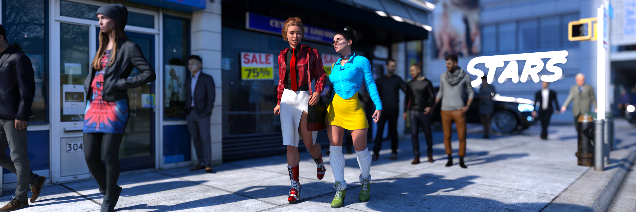 Recent buys: dForce SU Fashion Biker Outfit (top, right model), dForce SU Shirt Dress (right model), dForce SU Casual Style Outfit (jacket, left model), dForce Cute Kawaii Outfit (shirt, left model), dForce SPR Campus Suit (tie, autofit mangled it; so I fit to nothing, maneuvered it into place, zeroed cutoff opacity on other parts, scaled its neck bone). Thanks for this thread SapphireBlue and everyone who kept it alive with your cool renders!