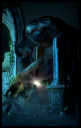 (2) Noir Lighting. Film noir from the 1940s is all about moody lighting, often using a key light on the face and a rim light to outline the subject. To heighten the sense of mystery and horror, perhaps you can dial down the intensity of the foreground light, leaving only the red highlights to define the outline of the figure (particularly the horns and the bat wings) and of the architecture in the background. Then shine a focused lamp on her face. If you set the angle right, that catchlight should set off reflections on her fangs and eyes, upping the drama.