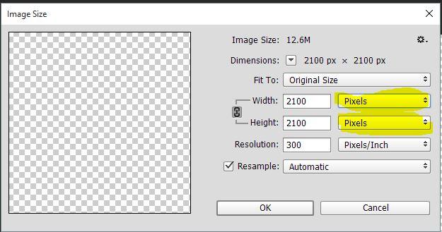 In the measurement (highlighted) boxes pull down and select Pixels - tadaa! The number that appears is the correct pixel count for a 7x7 inch box at 300 pixels per inch.