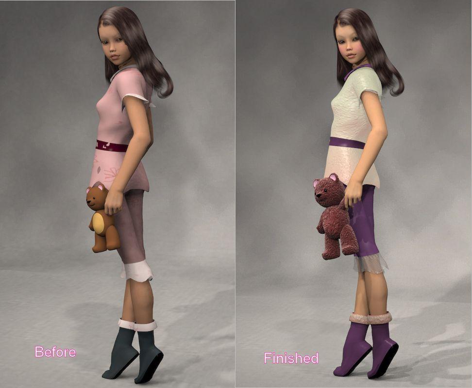 2. All of the clothing has had the smoothing option applied to them. I also applied the smoothing option to Nelly to smooth out some of the ugly bends on her. All of them are the default values. I also tweaked her left eye to bring it back in alignment with the right eye.