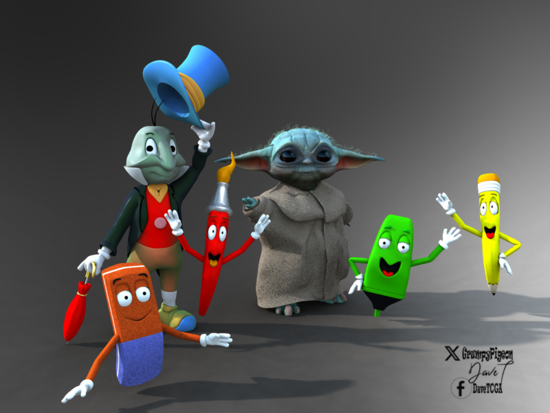 added some legs to Grogu and some head detail then boned him and some morphs to Jiminny and a protractor from an oval