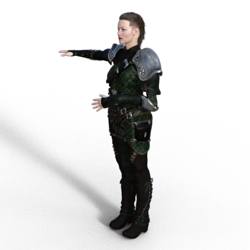 6. If we've got here, is it possible to explore a few bends of Natu in clay render to check if the rigging has gone right at this point. One where poor arm rigging shows up fast is with one arm down at the figure's side, elbow bent forward, hand bent across the tummy, as in the image: