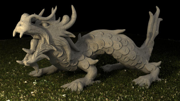 The xyzrgb_dragon on the grass looks gorgeous. It's rare you have the nerve to wait 28 hours for a render. Light is excellent.