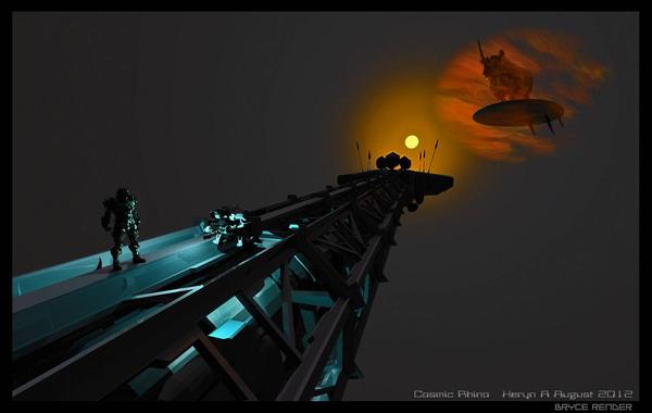 As a Bryce render contribution, here's one of my my Comic Rhino scenes: "A rhino came by......." Tired of waiting for man to explore the universe with their hulking, troublesome machines, bureaucratic bumbling and infighting, the black rhino as taken matters into his own hands and set out to find new worlds....