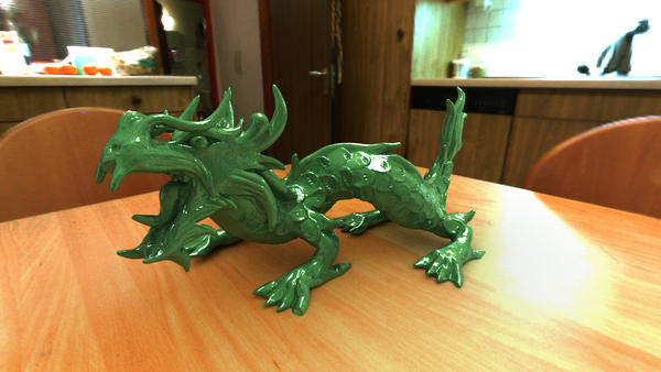OK I needed to eat - it happens occasionally. This one in 15 minutes, 144 RPP and slighter higher resolution. Comments on the lighting environment welcomed. The Stanford Dragon xyzrgb is mid grey and the Trans Am is from Turbo Squid. Again Horo's HDRI.