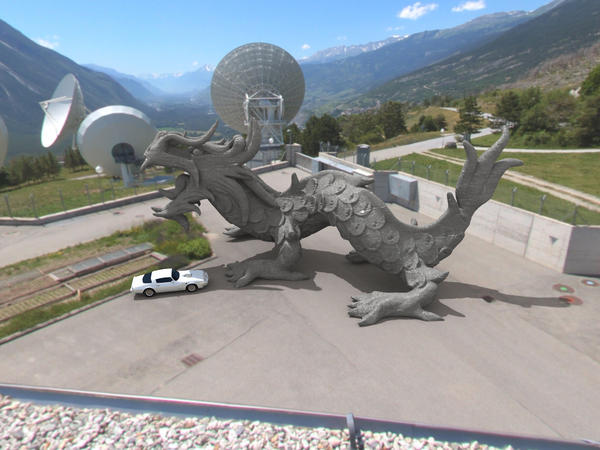 The only problem I would see if it were meant to be a render: the surrounding parking area/shrubbery is blurred while the car and dragon are not.