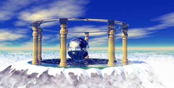 @canyon: I think your first image is great. The reflection of the pillars on the dais is great, as is the reflection of the pillars on the silver planet. Using the black to form the geometric is one thing that sets off the scene. But what I think is the key to that scene is the sky; which looks like a default sky. That sky gives the entire scene the illusion that it's floating, that it's a mystic place, a part of a fantasy story. Some may question that the horizon should have been adjusted, but I don't think so. It's that horizon that helps give the scene it affect. That's a very well done scene.