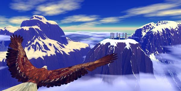 @Gussnemo: I misunderstood you, I thought you did not like the dome. I,ll put another one in soon. But for now I resetted the scene. To the concept I had in mind. I,m tried to change the filter for the snow on the center mountain but I,m not getting good results so I keep it as is. I,ll experiment with it later. The eagle I used before. Like to use better lighting on the mountain thou. I have another concept of putting a white/like marble structure to blend in with the scene. I,m sure you guys has done scene like this before. I added a less haze version??