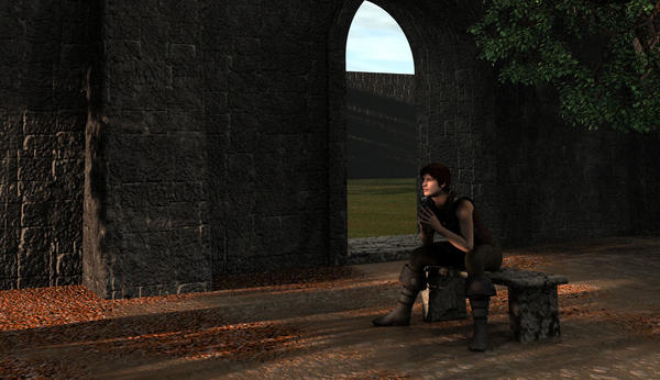 It started with the texture of the wall. Then I thought a single wall is a bit boring and added the archway and the yard. Afterwards I changed the light to an evening mood and added the trees, of which you can hardly see anything, except the shadows. And in the end I added the thoughtful young man. Et voila suddenly I got an medieval scene (kind of).