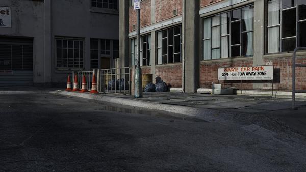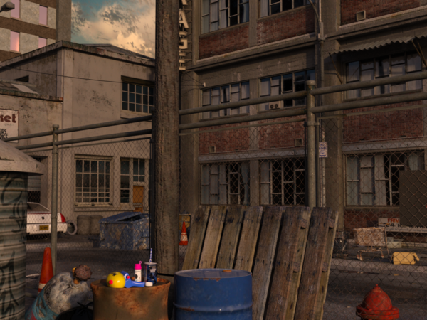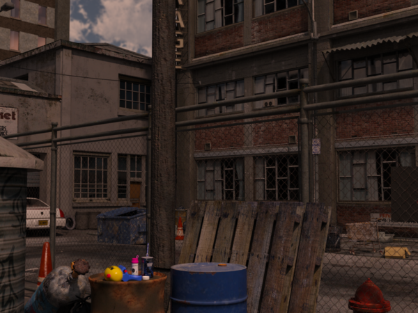 ...actually I am getting decent reflections in the windows of "Garage" building (bldg #4) just by changing them to the basic Iray shader then adding a topcoat layer for the reflection. Changing the window glass itself to Iray Thin Glass removed the drapes/shades since they are actual photographic textures.applied to the geometry. I didn't bother with the glass in building #3 (the grey one) as it is supposed to be grimy and hard to see through (maybe could have used one of the frosted shaders, but that would have been too "uniform" looking).