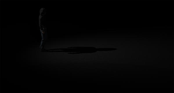 I tried doing something with a silhouette in the doorway of The Old Warehouse, but couldn't seem to get the effect I wanted, so yesterday I went yet another direction. A very simple scene with G2M wearing Urban Survivors HD minus the vest. I applied the leather Iray shader to the shoes with a darker base color. The ground is a plane primitive with the Asphalt Iray shader applied. Two spotlights: one behind him with strong light to produce the shadow; one to his right with low light, geometry set to disc, to simulate ambient light and soften the transition from the back to front. I also lightened the hoodie texture so it would reflect more light. There is a slightly darker arc on the ground, I assume the second spotlight is blocking the first one somewhat. It gets covered by the text so I didn't bother trying to fix it.