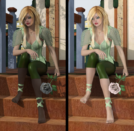 Using Super Dress and Super Leggings, I gave my character leggings that came just below the knee. But when I rendered the scene in Iray, her legs came out really dark. After a bit of trial and error, I was able to determine setting Cutout Opacity to 0 didn't prevent the invisible sections from affecting the render. I suspect the hidden sections are casting a shadow. The DAZ Rose has the same problem. The petals, calyx and leaves all have a hidden "back" for 3D printing purposes. The white rose came out gray.
