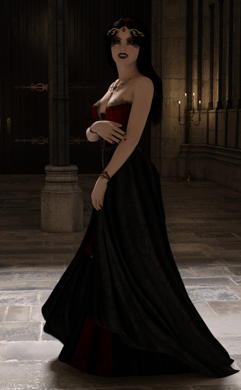 Danika (with fangs) Iray Test. MFD Gothic and Romance Hair,changed the flowers to blood red to match the dress. Aslan Court. Not thrilled with the lighting the extra light is too white and too bright but for some reason this took over 8 hours and was at 87% when I stopped it. For a character test, it wasn't worth doing it again just to move one light.