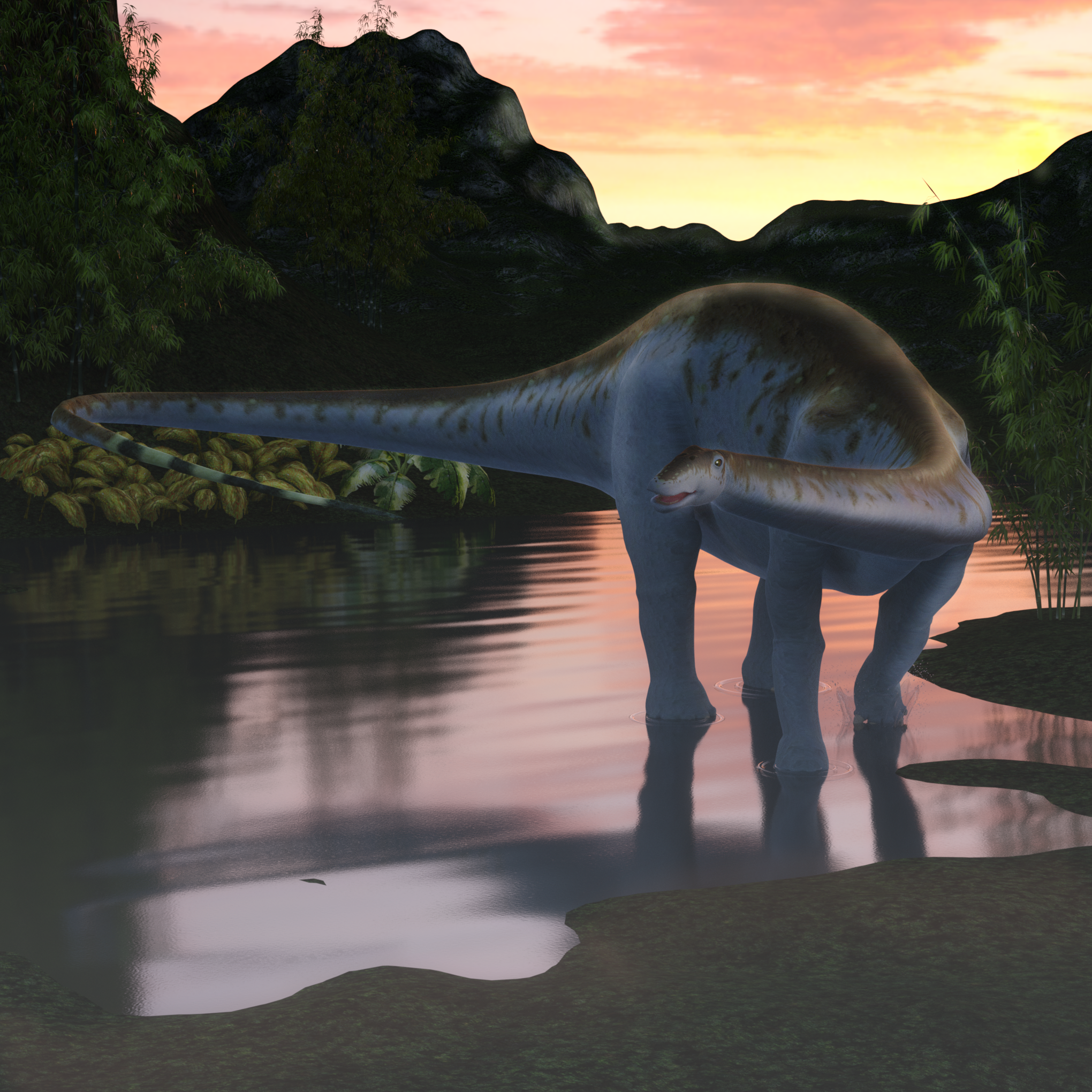 Apatosaurus at Dusk. This one is slated for some postwork but I'm pretty happy wit hte way the skin turned out on the dinosaur