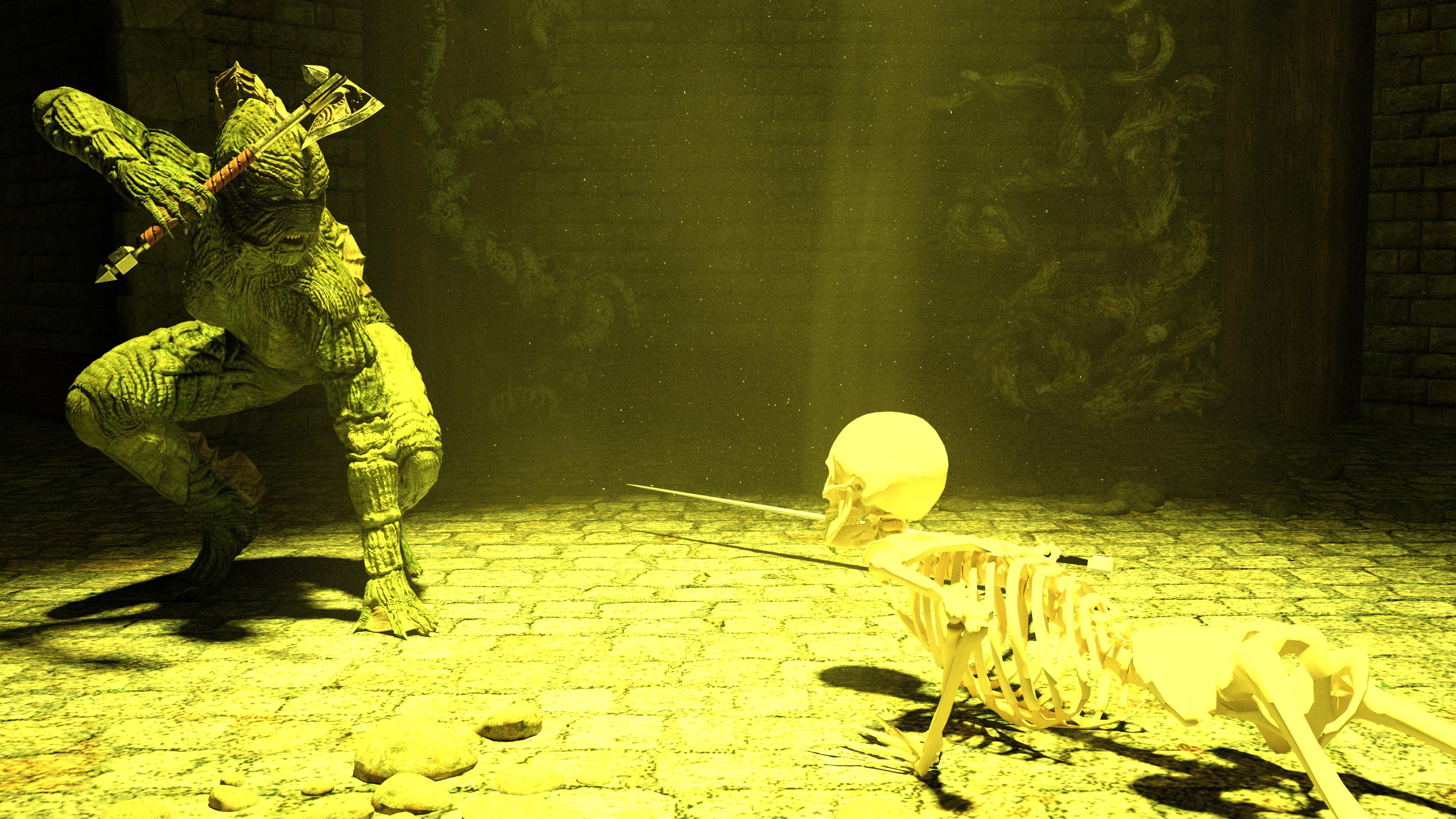 Is the skeleton trying to sneak up on the fish person?? :P Almost reminds me of the Stargate sg-1 episode called I think, "Into the Fire" Daniel gets captured by a fish guy who is looking for his wife/mate who came up missing about 5000 years prior. In the mean time, everyone thought Daniel died in a fire on the planet they visited.