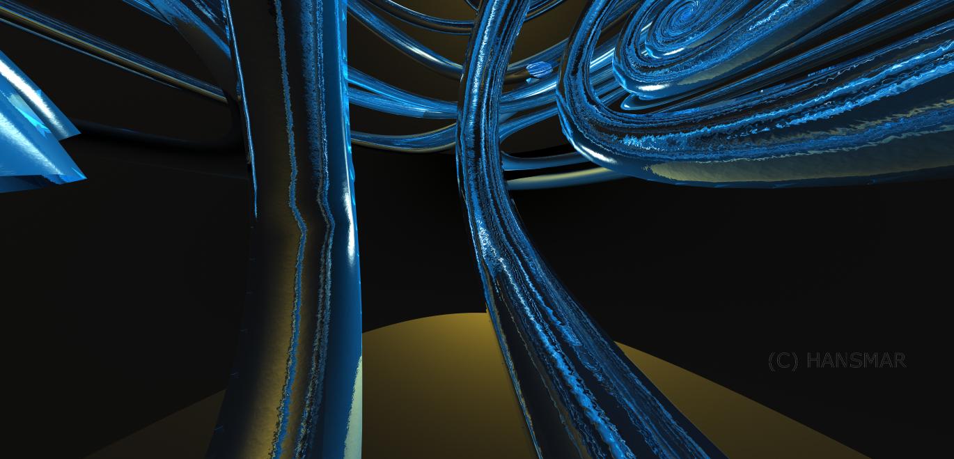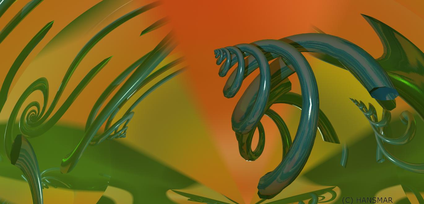 Two opposing spirals lit by an HDRI and seen through a fish-eye lens. This is the third version, the final 11th one is shown in the Show Us Your Bryce Renders Part 13.