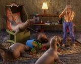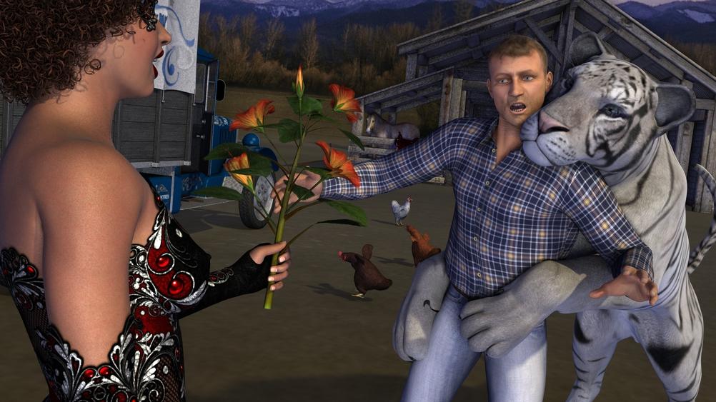 Circus - Finally winter was loosening it's grip. The sun was warm, soon the trees would bud and the carnival would come to town. In his green house admiring his prize hibiscus, Gus noticed a circus truck stopped at the end of his farm. A young lady dressed in a skimpy costume had gotten out. Quickly, he snipped her a stem of flowers and hurried down for a closer look and to see if he could be of help. He'd no sooner given her the flowers when he was grabbed from behind and held in a bear hugging, furry, embrace. "Oh", the girl exclaimed, "Sinbad likes you!" Gripped with terror, Gus managed to gasp - "I'm allergic to cats."