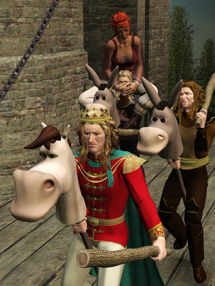 @Gopherus #2 - oh I love that! The king looks very disgruntled and somehow a stick just isn't the same as a nice shiny sword. And I especially like the implication that the cutback is so severe that they could only afford fake donkeys for the followers!