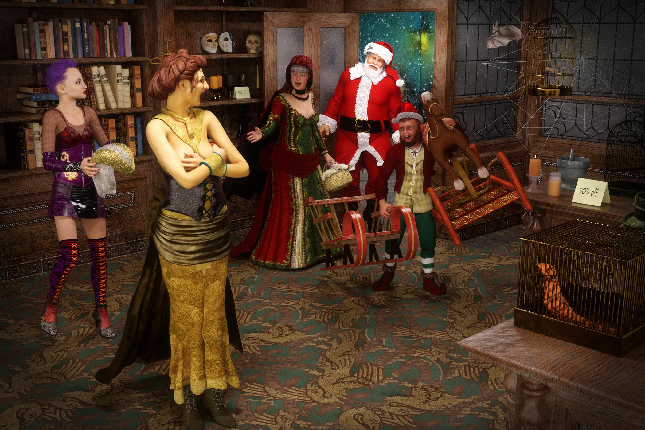 Before Balea could change back into her more dignified attire, Ms Yultide and her cohorts burst into the shop, ready to take over the shop for the Christmas season.