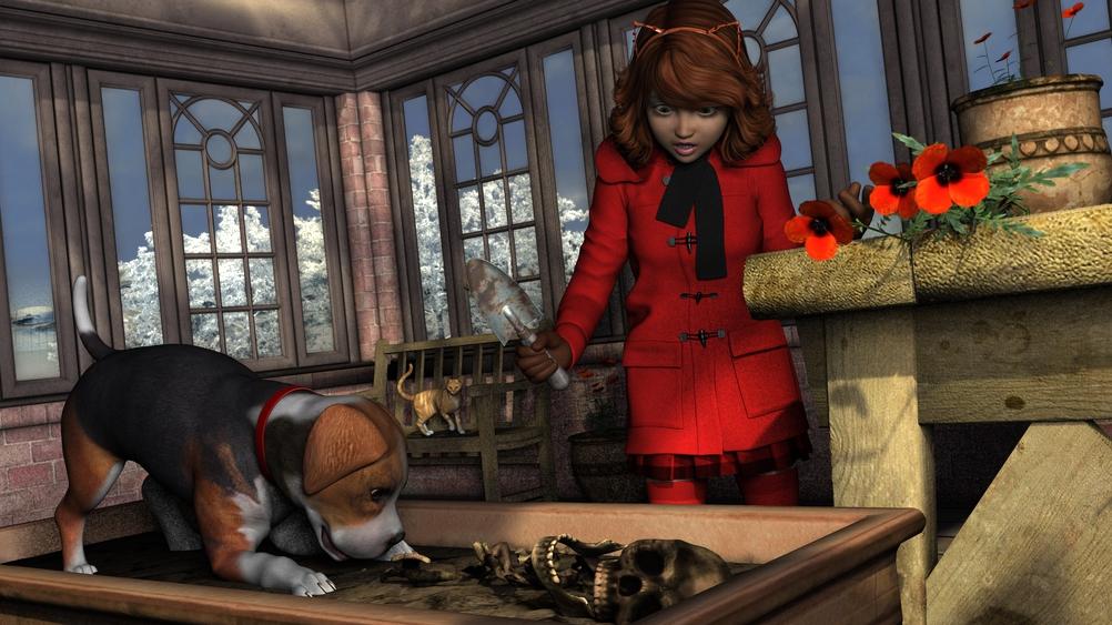 Scraping around the rocks in the dirt bin, she was able to fill two pots without getting any dirt on herself. Everything was going so well... she was just finishing up the second pot, when the puppy, jumped into the dirt box. Jenna turned to shout - NO! Bad dog! You'll make a mess... but the words stuck in her throat. As she saw for the first time, that what she had assumed to be rocks, was a skeleton! Grandma was always telling stories about the families ghosts. "Skeletons in the closet", she would say...