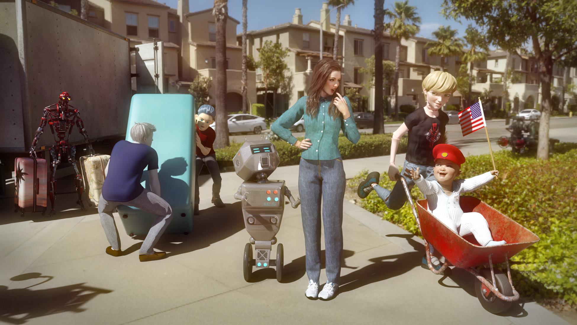 Lana's helpful robo helper invited its friends to help Lana move. She was uneasy at first and did not like the rudely jovial oversized kewpi doll (who would make something like that?) But once everyone got their instructions and settled down thing went well.