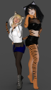 And for some fun (and to really put a lot of these products to use), here's Calico and Tora striking a double Lucky Cat pose (based on I13's K-Pop poses, transferred over to G3F thanks to Zev's Pose Converter, and mirrored with Pose Builder).  Getting Tigerlily's tiger-girl texture onto Creature Tail was loads of fun in Photoshop.  Calico is the base G3F, modified by Growing Up, Shape Shift, Breast Control, and 200 Plus (which is amazing​, by the way).  Her boots are from Duffle Dream.  Tora is the base Belle figure with some fine tuning in Shape Shift and Breast Control, FangTastic, Creature Creator, and Tigerlily's cat head morph.  Both are using Anime Kitten Hair; the variety of surfaces on that model let me create a calico pattern for Calico's hair without having to break out Photoshop.  And, of course, Fit Control on both for a variety of fine-tuning.