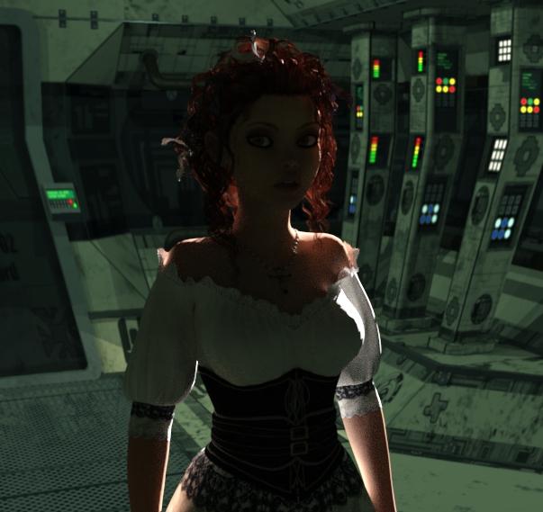 For this image, I've only done a few shader tweaks. All content should really have all of its shaders tweaked for Carrara when used in Carrara. But for this all I did was to add the glow maps to the glow channel where applicable and switch the glass material from using alpha to using transparency. Much better. It should also be mentioned that anyhting in the glow channel in Carrara will add to Full Indirect Lighting as actual illumination.