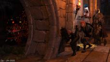 I initially wanted to show him more, but the Contemplation Pool's walls are large and I needed more space for the group of characters so I pushed further and further away but in the end, even if it is looming in the shadow, ready to strike at the first missstep, I think its glowing skin should catch anyone eyes