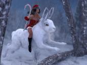 I added some PS Brush effects to this version for the steam from the rider and hare's mouth because of the cold conditions. I wanted to add just a very subtle effect rather than like steam from a kettle which I don't think would feel right. I also added snow being flung-up from his feet as he jumps over the fallen tree limb. I felt that the image was out of balance so added another tree to the left and shifted them all around a bit to also provide a better feeling of depth. I tweked the lighting by playing with the size and shape of the additional photometric light I added to the scene to get the scene a bit brighter.