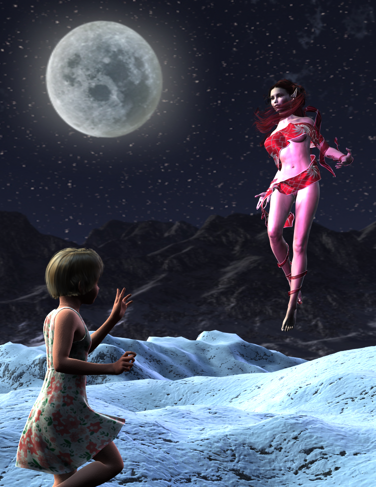 I actually tried to do this one with trees and such, the girl being led into a dark snowy forest, where wolves waited. However, the trees from Winter Wonder defeated my poor PC; whenever they were added, things slowed to such a crawl that I could do nothing. At least it saved me buying Wolf 2, for now. Also, I had no idea how to depict footprints left in snow.