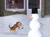 I was going to say that the falling snow looks good, and it does, but when I looked a little closer on it it becomes clear that most of it seems to be too large and almost looks like white confetti rather than snow. It's especially noticeable in front of and to the right of the snowman's hat. I don't know what you use for the snow, but perhaps it can be shrunken down in size?