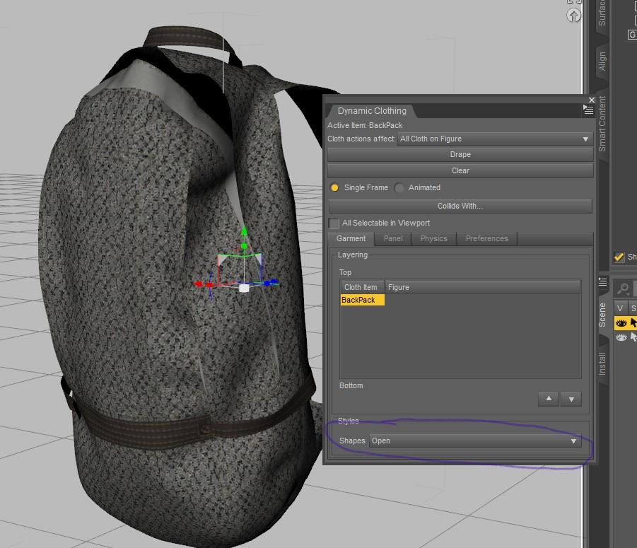 I bought Dynamic BackPack (https://www.daz3d.com/dynamic-backpack) two days ago. I installed it today and it still does not have the open or close shape options. Has anyone solved this?