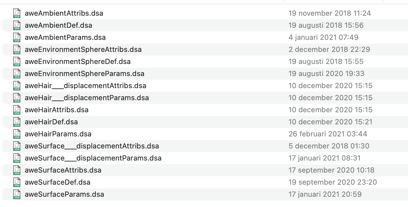 Hmm, first check in Applications/DAZ3D/DAZ Studo4 64Bit/Shaders/wowie (for the DS version(s) you intend to use with aweShadingKit) that all the shader files are in there, should look like this: (Note, older build here on my laptop, the dates may vary)