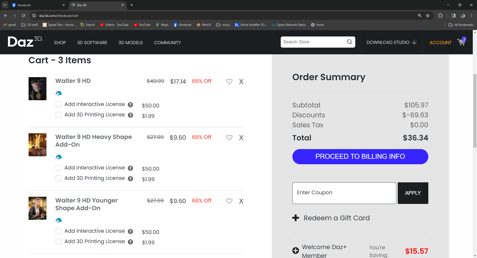 If I do the math right the $76 cart I see at the moment would have been only $36 applying 8 tokens (full 45% DAZ originals discount). For that price I would have surely bought it which I won't do now as the price for just the bundle and addons is too high for me. Also getting some further 3 tokens would have probably made me do a follow-up purchase to use those. As it is I won't spend a single cent.