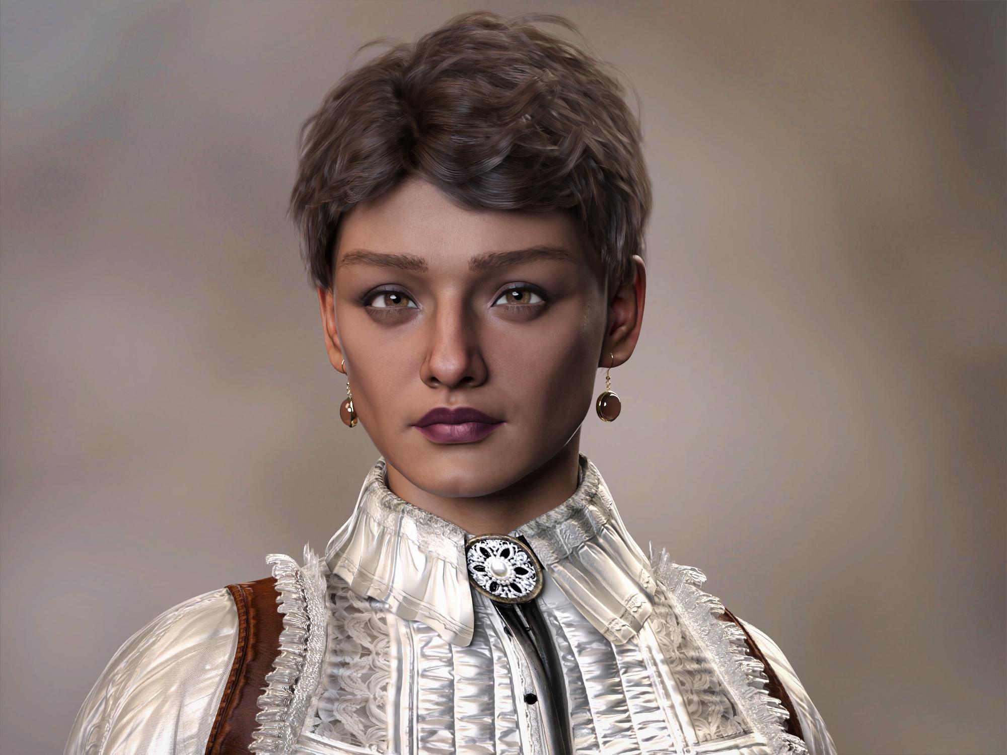 I made this randomized person and also used the Expression Randomizer at low settings. I was only doing a portrait, so I only randomized the head, by creating a set of People heads and randomizing from that set. I used Zahara skin, but it was too orange for me, so I toned it down with 1CPBRSkin. I like this interesting combination of male and female heads that the randomized selected.