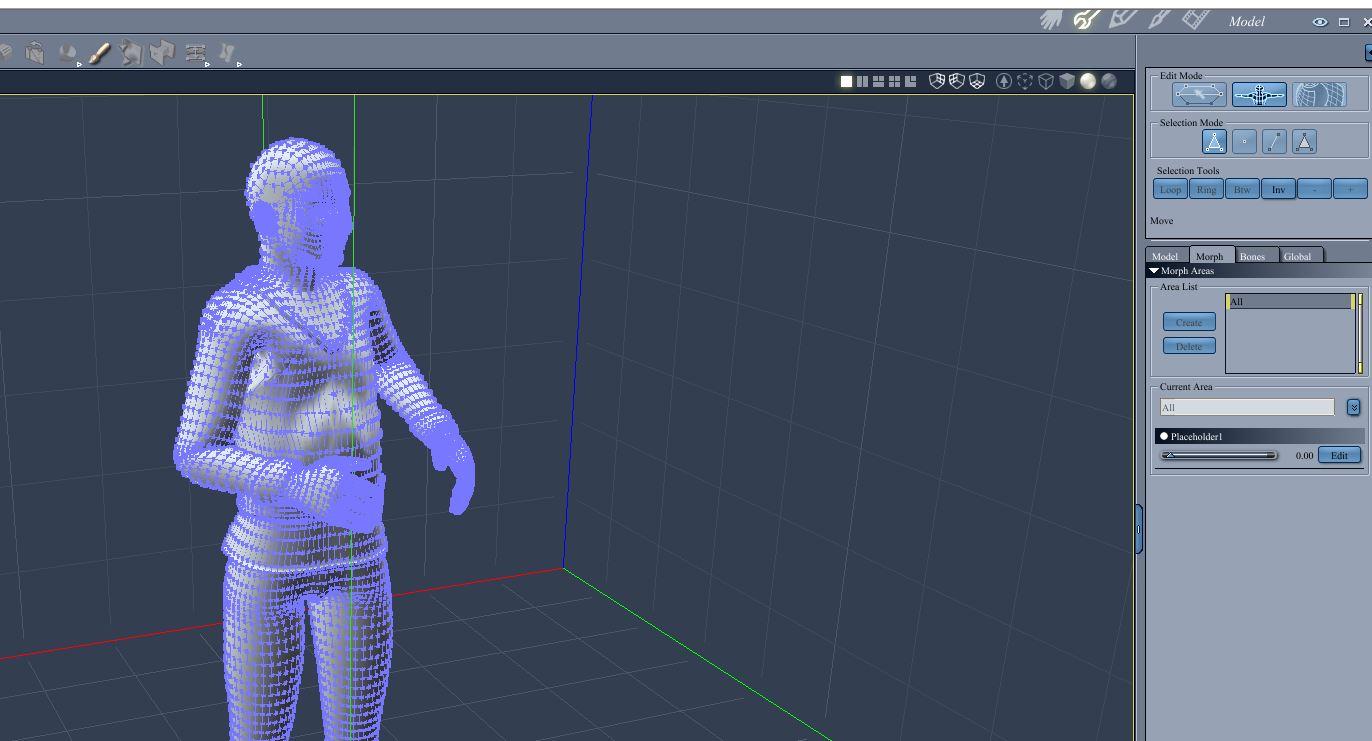 - For Poser-style rigged figures, such as Vicky 1-4, Michael 1-4, Aiko 1-4, Star stand alone, etc., Carrara has a lot of great options and functions.  First, as mentioned above, you can load the figure in Carrara, edit the mesh directly, and save the result for future use without ever adding morphs.  Carrara has the magnet tool and the displacement painting brush for loaded figures.  Second, you can load the figure and create and save new dial morphs.  A morph zone must aready exist to add a new morph dial.  Here, I loaded Aiko 3 and note that under the morph tab of the vertex modeler (model level) there are already morph zones by body part.  Third, you can actually make the morphs in another program (such as hexagon) and load them in the appropriate morph channel.  The weightzones figure can be edited in the posed position, which is a great help.  Similarly, a new morph can be added in the posed position as long as a morph zone already exists.