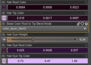 Hair Dye Weight - The name describes it perfectly. This is where most of your color comes from. By default it is set to .3. Going higher will make more of this color come through. Downfall is that it will mattify the hair just like hair dye would. This is an option to turn down shine but dont go crazy with it.