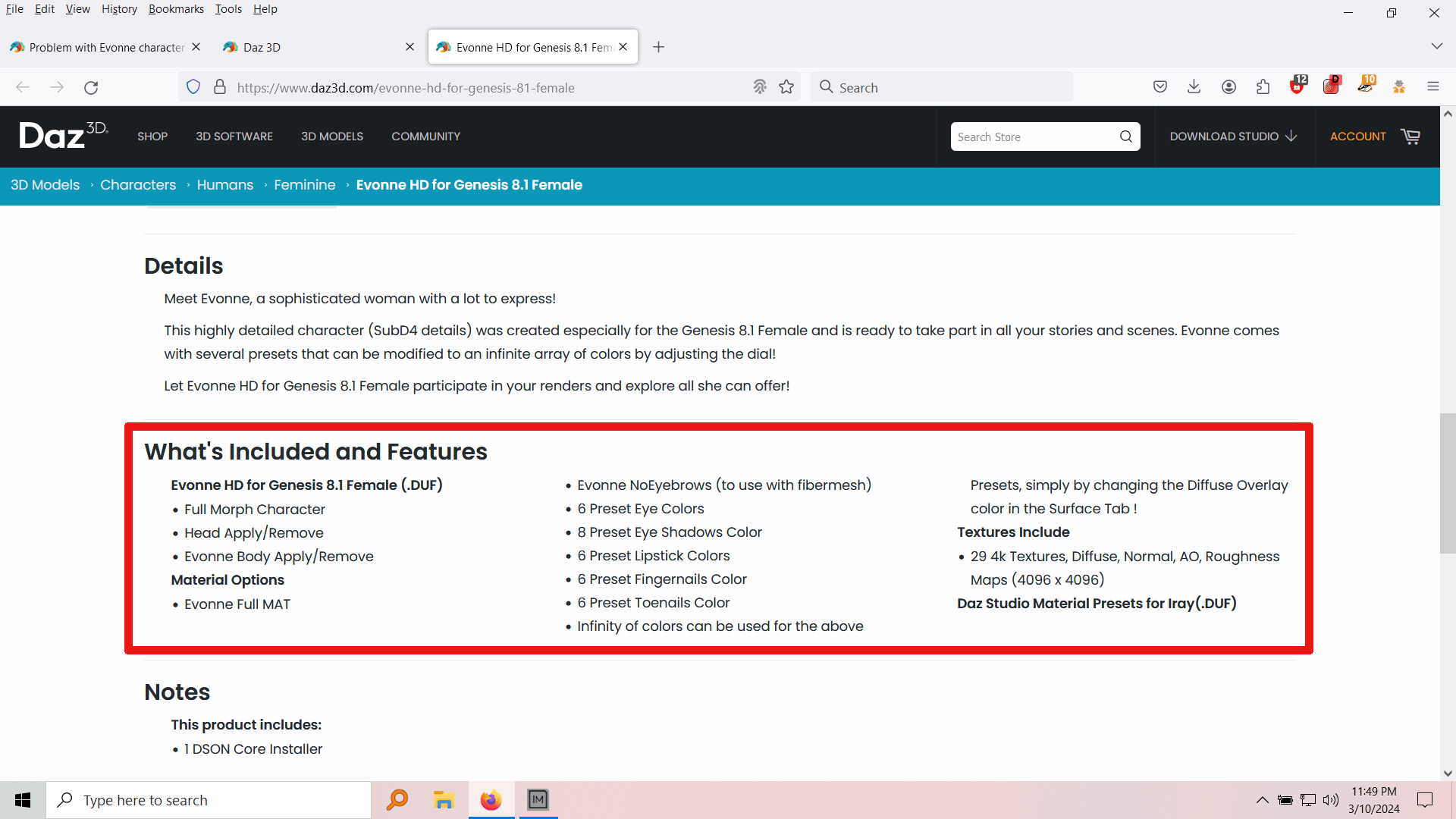 I bought the Evonne character and the character appear without hair. Is this normal? Also I try to change lipsticks or to add hair from materials but is not changing at all.