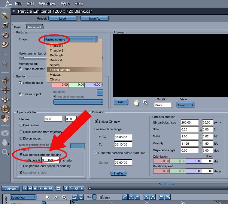 TIP: Once you get the particle emitter set up the way you like it, save it to your browser and delete it from the scene to work on the rest of your scene to save you from having the emitter calculating every time you change time or move the camera, etc., then just drag it back into the scene when you need it again.