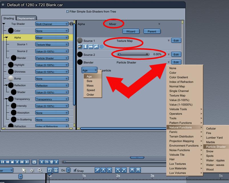 We also need the particles to fade over time. So in the shader's Alpha channel, we select Operators > Mixer and use our cloud image in Source 1 and a value 1-100 set at "0" in Source 2, which gives the equivalent of black. For the controller of the mixer, we go to Natural Functions > Particle Shader, and set the "of Particles" button to "Age"