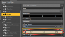 More data I'm trying to access by script... the color values displayed for Iray Uber Shader colors are expressed as between 0 and 1, and are what I need to use in my scripting; when passed to my external app, they give me a matching color. I can't seem to access them, though. The value is not the 0-255 value divided by 255; that's signficantly off. Does anyone know how this is computed or where it can be accessed?