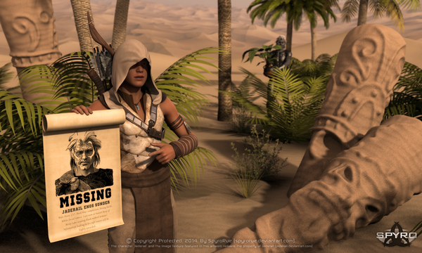 "I'm looking for this man, have you seen him?" Spyro has traveled half way across the world and is venturing the warm sands of Elsweyr in search for the Dark Elf. Unfortunately, the Khajiit have turned up no leads, though they all seem keen on purchasing the pot plant with legs...