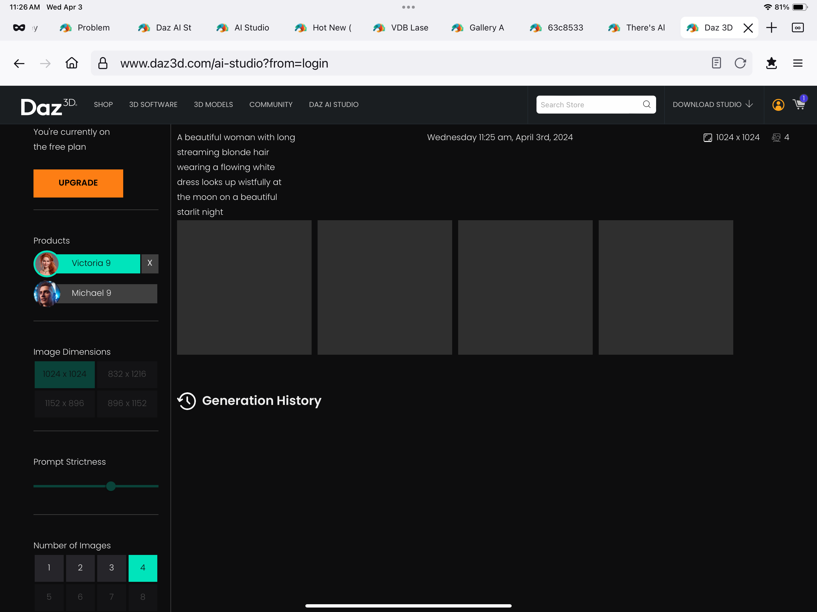 I don't know how it works on an iPad, but I have discovered that choosing a model doesn't seem to work. Try just using your description (it wiil automatically use Victoria 9 if you use "woman"), then click on Generate. A green square should show up in the lower lefthand corner of the boxes when it begins creating your image.