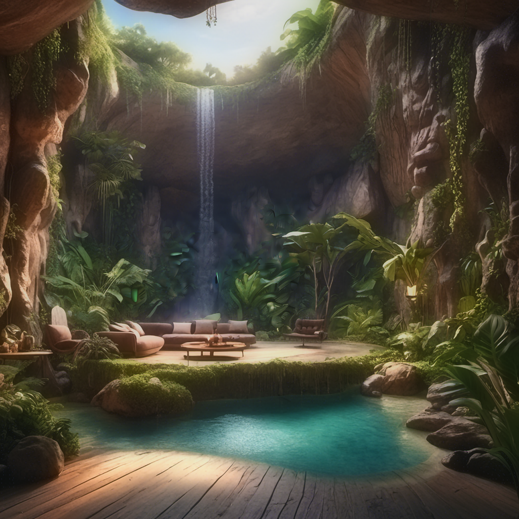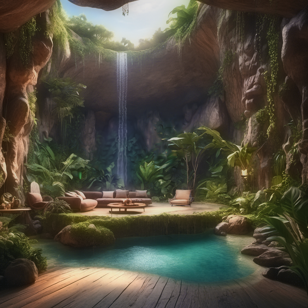 ​Another fantasy cave.. the first is the original and the second I asked Photoshop AI to fix what appears to be a one legged chair and change the waterfall slightly