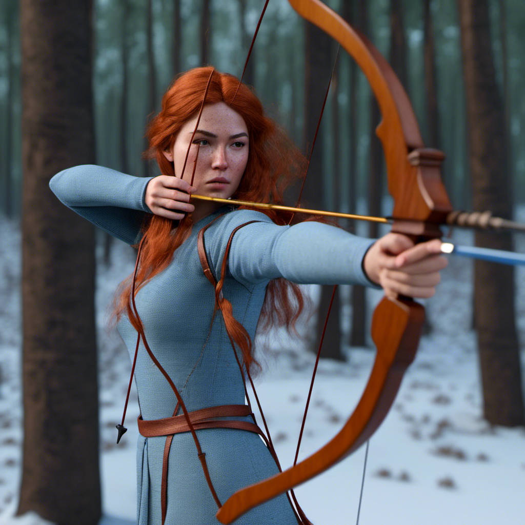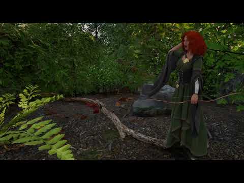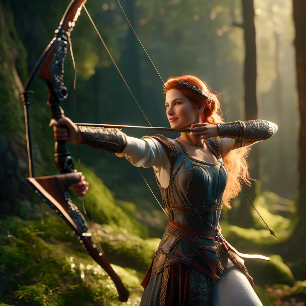 maid Marian stands gazing wistfully in Sherwood forest, wearing robes of green, her long curly red hair gathered loosely in a long ponytail, dynamic lighting, crepuscular rays, dappled shadows