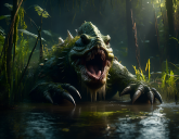 Thank you very much for your prompts, Bunyip02! Some are a bit difficult for the program to present (e.g. 'Virtual reality becomes indistinguishable from real life.'), but you give us a wealth of inspiration. Today I shortened your prompt 'A swamp monster lurking in the murky waters, waiting to drag unsuspecting travelers under' to 'A swamp monster, waiting to drag unsuspecting travelers under' and received great pictures.