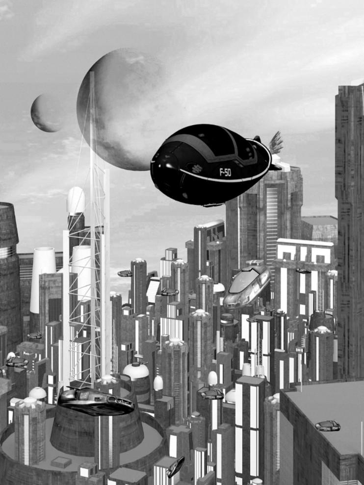 To be honest, it looks kind of flat. And eveything is bumping into each other. The antenna and the zeppelin (?) are bumping into the moon. The skycar is hardly distinguisable from the buildings behind it. Its very busy, with little differntiation... everything is on these vertical lines that run through the image from top to bottom.
