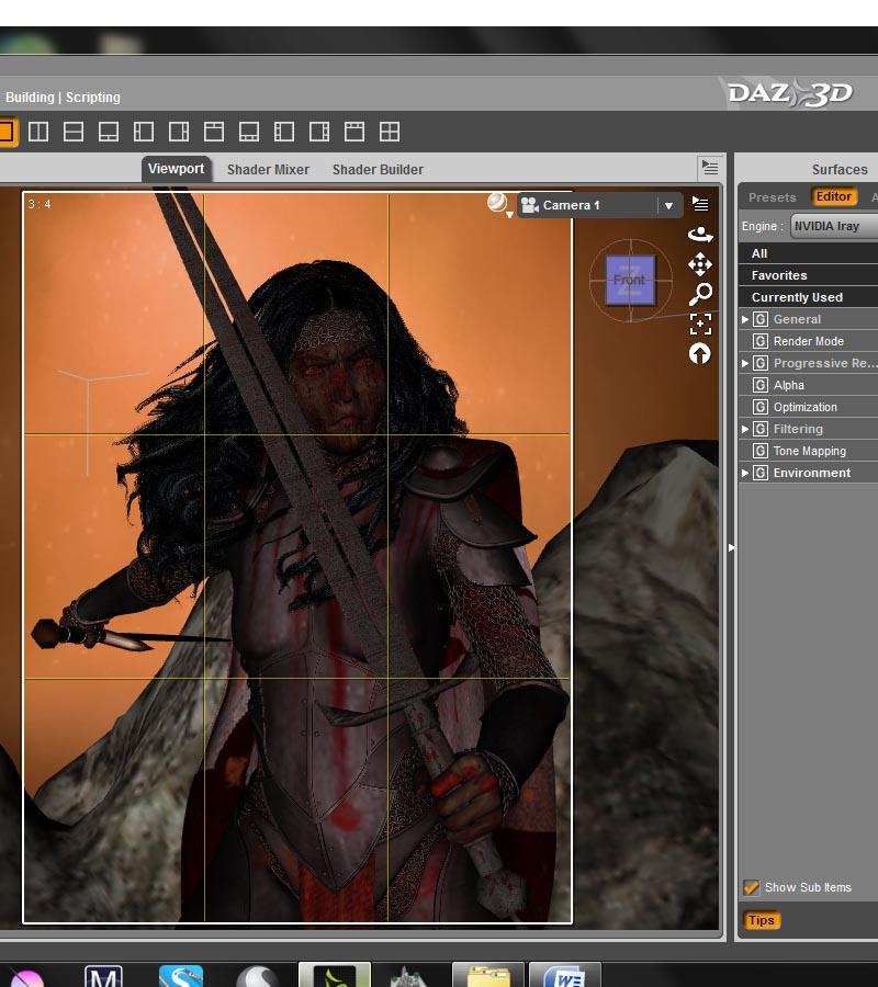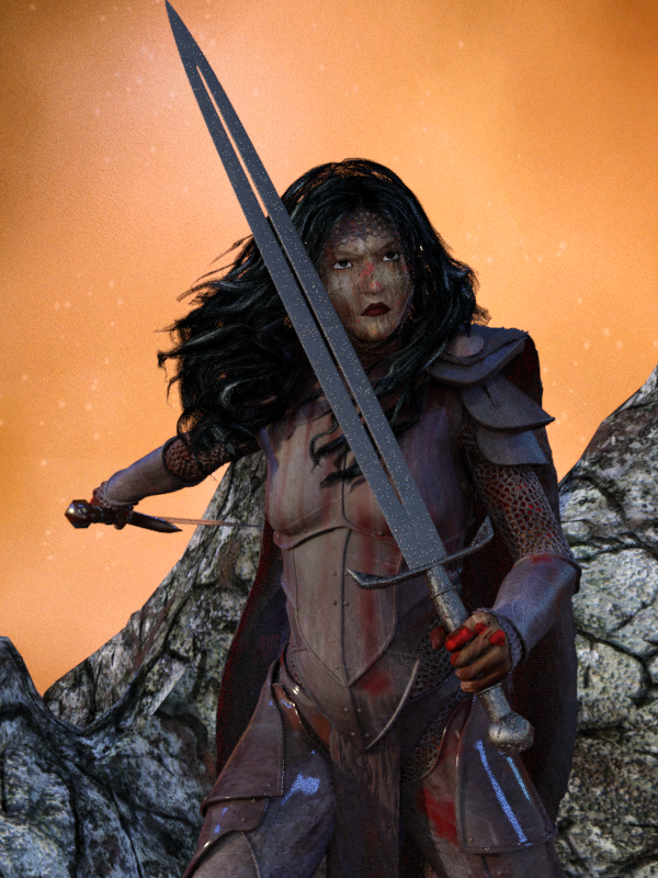 Thank you everyone! Yes I noticed the lipstick once I could see her face but it was just too late to mess with it anymore. The rocks actually are right behind her, they are part of the prop she is standing on so I am not sure how to fix that. I could of course just take them out completely and use something else farther away as you can't see what she is standing on anyway. I will give the emissive plane a try although its not as critical now that that I can actually see her face lol. I do have a fondness for lefties since I am married to one lol. I'm not picky I figure she looks like she weild those swords quite well with either hand. I am headed out the door but will work on this later.