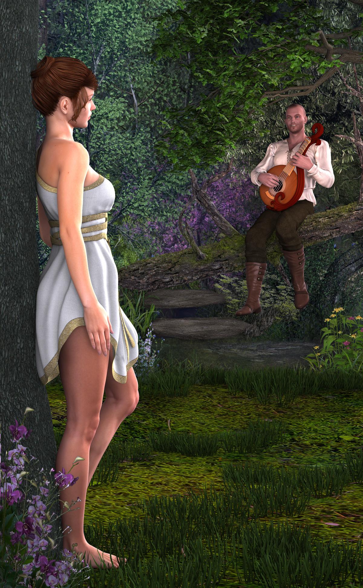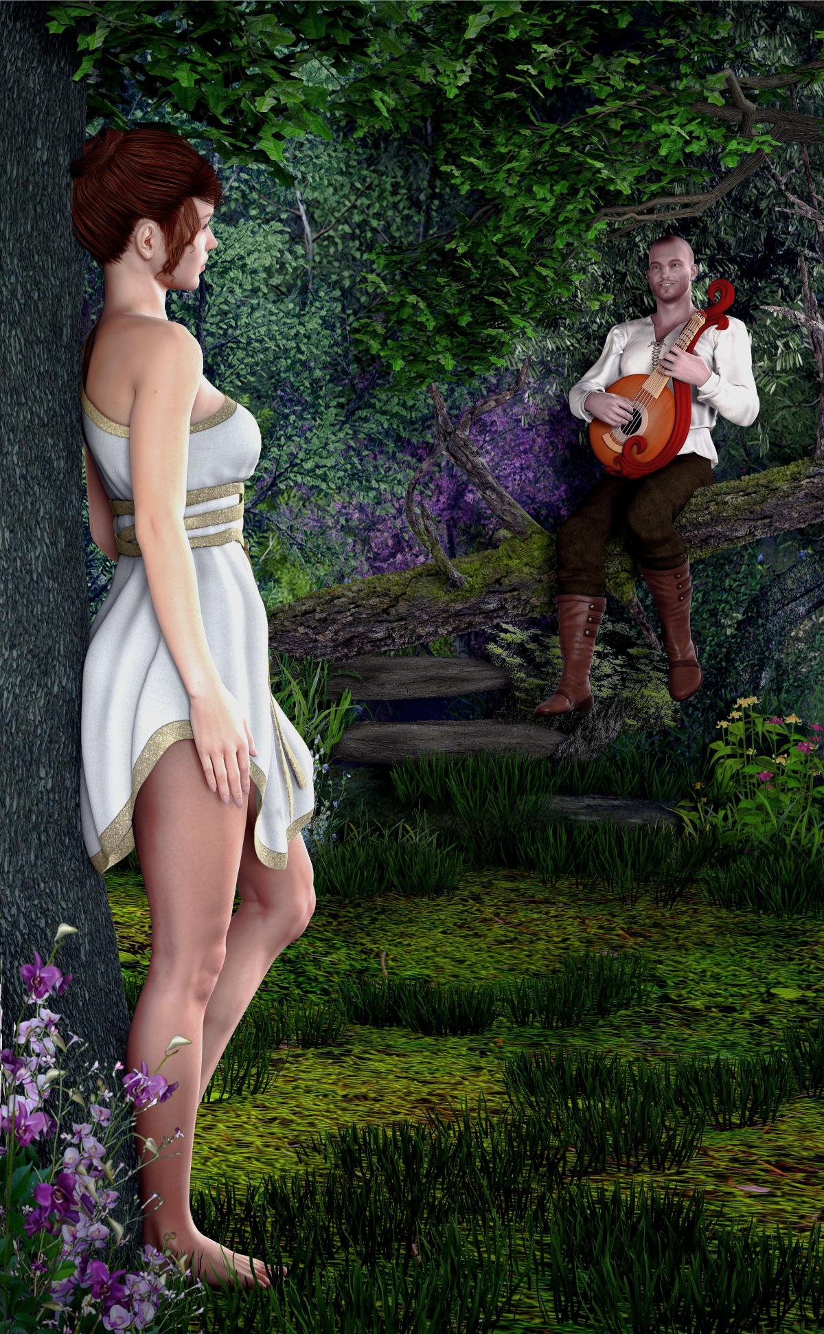Regardless...there's good stuff here, but... its way too tall. Crop your female model around mid thigh. You lose my interest when I have to scroll all the way down to see nothing much (though I would take those nice purple flowers and see if I could put them in her hand or in her hair?). This distance between your characters is good, something seems a little off but I can't quite put my finger on it. He's not quite looking at her, its hard to tell what she's looking at, but it looks close enough. The background is colorful and distracting, especially the big tree limb that dominates the center of the image. That needs to go. It keeps drawing my eye... its the very first thing I look at.